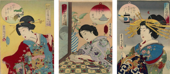 浮世絵は、元々時代の嗜好をとらえ対応することによって売り物として成立します。明治初期までが、新たな文明の流入とそれを受容する庶民の嗜好との間にある存在として、継承された江戸浮世絵の中で対応できた最後の時期でした。ここでは、幕末の三大絵師が亡くなった後、江戸の浮世絵を継承し活躍した明治第一世代とも言うべき浮世絵師のうち三人をご紹介します。