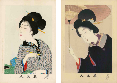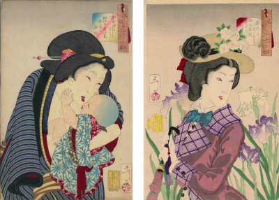 士族に生まれ、十代で国芳・国貞にも学んだとされますが、その後豊原国周を師とします。幕末にデビューしますが、武士として戊辰戦争に参加、官軍に捕えられ東京に戻った後の明治10年頃から戦争画や役者絵などで絵師として再スタートしました。その後、文明開化の風俗を流行の鮮やかな色彩で表現した3枚物の作品で人気となります。浮世絵衰退期へ入った明治20年代末においても、幕府の御家人であった経験を生かし、江戸城の大奥や幕府行事などを扱った3枚物の「千代田の大奥」「千代田の御表」シリーズにより大衆の人気を集めました。さらに、1枚物の美人画シリーズ「時代かがみ」「眞美人」では繊細で柔らかな色彩を用い、明治の美人大首絵として独自の表現を確立しました。 明治第一世代の中では長命で明治30年代にも活躍し、時代に対応した代表作を生み出す他、肉筆画でも共進会などに出品した絵師ですが、その画風は第二世代に顕著な近代日本画との融合などの点において異なり、あくまで浮世絵師として継承・発展し続けた絵師といえるでしょう。