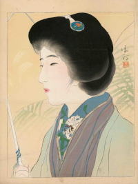歴史画と美人画を中心に確固たる地位を築き、木版画は版元の秋山武右衛門と親しく、「三十六歌撰」「茶の湯日々草」「今様美人」「三井好都の錦」など近代日本画風の繊細で上品な作品を制作する他、口絵においても最も人気のある絵師でした。門下からは、鏑木清方・池田輝方・大野静方・池田焦園等多くの日本画家を輩出しています。