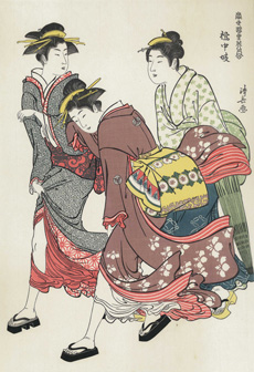 私達が今日よく知る浮世絵、錦絵(にしきえ)が誕生するのは1765年(明和2年)のことです。裕福な人達によって行われていた絵暦交換会(えごよみこうかんかい)の流行がきっかけでした。 当時は現在の太陽暦とは違って太陰暦を用いていたため、毎年月を示す暦を変える必要があり、好事家達は浮世絵で暦を作って仲間内で交換して楽しんでいたのです。 題材の選択、構図、色彩などで互いに競い合うというもので、その影響により絵柄だけでなく彫りや摺りの技術なども急激に発達することとなりました。絵暦交換会の流行によって台頭してきた絵師が鈴木春信です。 錦絵によって絵師、彫師、摺師、版元という強固な生産体制が確立し、以後浮世絵は時代を超えてさまざまな表現に華を咲かせていきました。