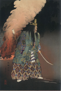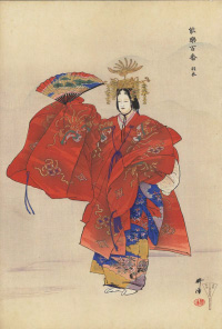 能の装束や曲の研究、舞台のスケッチを重視しながらも、能画について「能楽絵は能の決まりを守らなければならないが、細部にあまりこだわるべきではなく、写生一点張りではいけない、自分が能画を描くのも能のもつ典雅な趣味に強く惹かれるからだ」(『書画骨董雑誌』大正1年10月号)と述べています。日本美術協会展では審査員を勤める他、晩年まで各展覧会に出品を続け、自他ともに認める能画専門絵師として活躍。木版画だけでも1000図を超えると考えられています。-