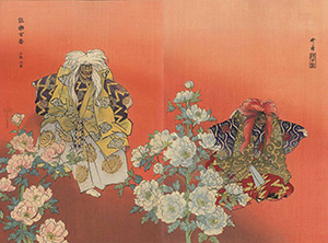 耕漁は、明治30年前後から能画に傾倒し始め、展覧会にも多くの能画を出品しました。その他、木版画では明治30年から5年をかけて全261図(目次含む)からなる「能楽図絵」、さらに大正11~14年には2枚組・3枚組を含む豪華作品全102図122枚(目次含む)などが代表作として知られています。