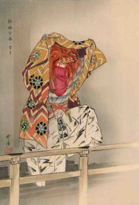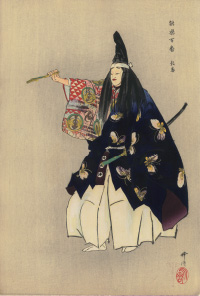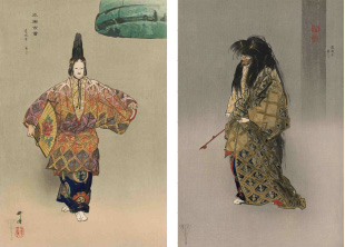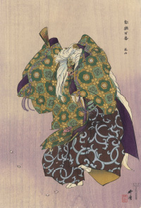 月岡耕漁が明治30年から制作した「能楽図絵」と同じ版元である「大黒屋松木平吉」より出された、目次2図の他全100図120枚のシリーズで、月に3枚ずつ制作されました。上質な奉書紙に耕漁の肉筆の筆致・色彩を再現するような技術に加え、金銀摺りなどを含む数十回の摺りを重ねた豪華な作品。背景を省き演者を中心として能の持つ幽玄の美を見事に表現した能画家月岡耕漁の木版画最高傑作にして、新版画全盛の時代に明治半ば以降培った技術で世に送り出した「大黒屋松木平吉」最後の大型シリーズ。
