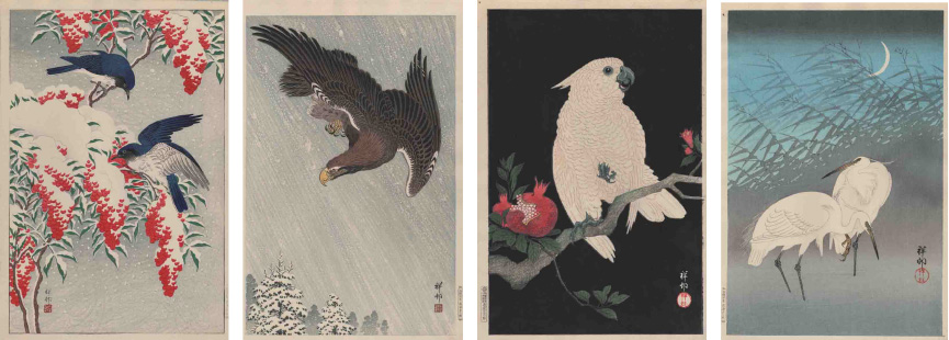 金沢市生まれ。菊池容斎の高弟・中島亨斎に師事し活躍した鈴木華邨に10代で入門。華邨は、日本画の他木版口絵でも活躍し、花鳥画を得意とした画家です。古邨は、明治32年から岡倉天心が中心となる日本絵画協会の展覧会や共進会に、花鳥画を中心に出品し褒状を受け日本画家としての道を進みました。そして、既に渡辺省亭や鈴木華邨の花鳥画が海外で人気を得ていた頃、古邨の花鳥画はアーネスト・フェノロサの目に止まり、輸出用の木版画の制作へと導かれました。