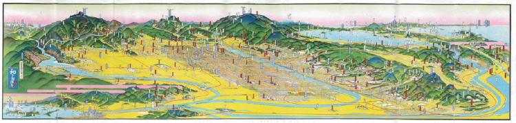 初三郎は、依頼主の意図に応じ自在に構図を操り、旅行案内図としての鳥瞰図を描くだけでなく、折図として刊行されたその裏面の観光案内も含め丸ごと請け負い、 そのほとんどを自身の工房と出版社により制作・発行しています。さらに、皇室・軍・旅行業界・全国の自治体等から広く信頼を得、その動静が注目される等一絵師の枠に留まらない活躍をしました。