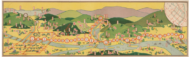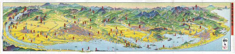 そして、大正2年京阪電鉄の依頼により鳥瞰図処女作となる「京阪電車御案内」を制作。翌年、これが時の皇太子殿下(後の昭和天皇)の目に止まり、「是は綺麗で解り易い」と賞賛されます。その一報は九州写生旅行中の初三郎の元へ届けられ、殿下の言葉を誇りとして一筋に「図画報国」の道を突き進んでいくのです。-