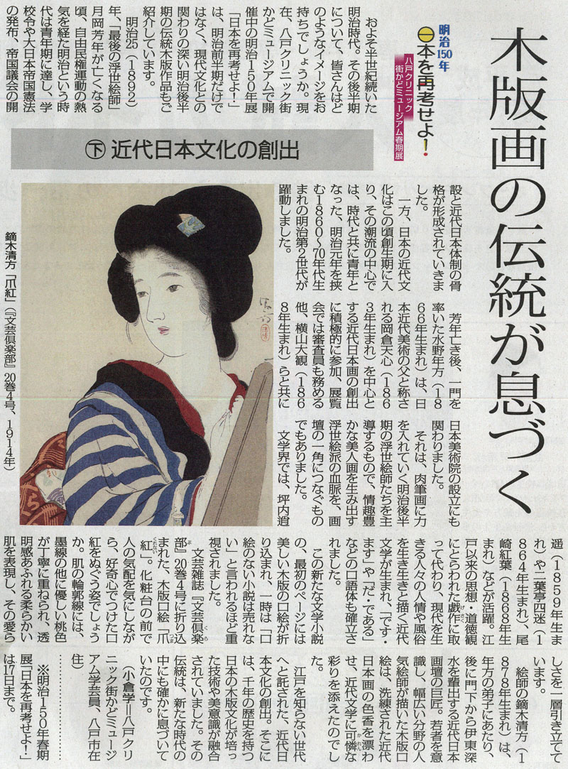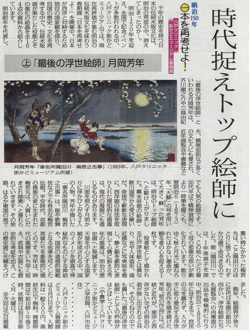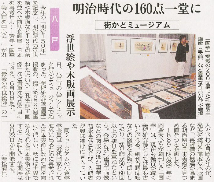 - 「明治時代の160点一堂に 浮世絵や木版画展示」(2018.04.23)