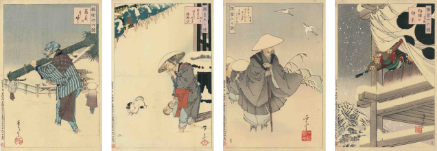 At that time, in the era that ukiyo-e was declining, the genre of “rekishi-ga” (historical ukiyo-e) got to be popular. Rekishi-ga was belong to the musha-e (ukiyo-e of warrior) of Edo period. But different from musha-e that expresses battles of warriors who are brave and daring by heroic deformation that is peculiar in ukiyo-e, rekishi-ga expresses loyalty and moral based on historical facts, authentic period costumes, customs and historical investigation about the time. “Zenken Kojitu” (by Kikuchi Yōsai) that is biographical writings with portraits and published in Meiji 1st was the bible of rekishi-ga and affected it. And Tukioka Yoshitoshi pioneered in the style of rekishi-ga. This popularity of rekishi-ga spread throughout not only ukiyo-e but also all of modern Japanese drawings.