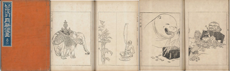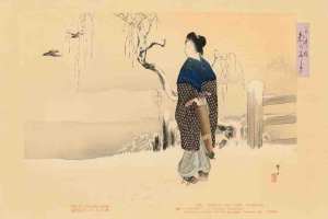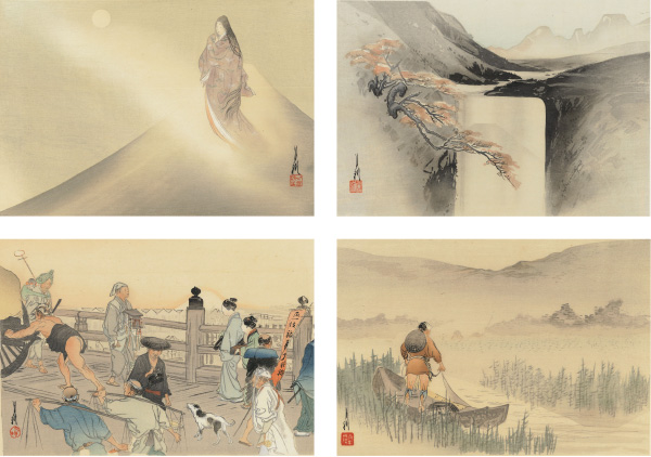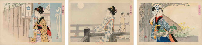 He created hand-drawings actively on the one hand and created illustrations, kuchi-e or ukiyo-e energetically on the other hand. In Meiji 20s and 30s when ukiyo-e was declining, he created several series of ukiyo-e such as “Gekkō Zuihitu”, “Hujin Hūzoku Zukushi”, “Genji Gojū-yo Jō”, “Gishi Shijū-shichi Shi Zu” and “Hyaku Huji”. His san-mai-mono (a work constructed by 3 prints) such as “Hana Bijin Meisho Awase” or “Bijin Meisho Awase” were highly regarded continuously. “Iroha-biki Gekkō Manga” which was published in 10 years from Meiji 27th, formed by 3 volumes, 21 books is also one of his masterpieces.