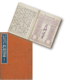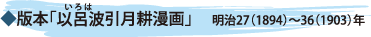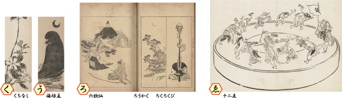 この版本は、月耕35才から44才までの10年間に渡り全3編21巻制作され、絵手本としてまた一般の人が手に取って楽しむ百科画集として人気を集めました。「北斎漫画」の明治版とも言われるその内容は、山水・花鳥・人物・道具類さらには妖怪や伝説など人間世界の森羅万象を描いた風俗百科であり、「い・ろ・は・に・ほ・へ・と・・・」と順番に描かれた絵の総数は1600図を超えます。