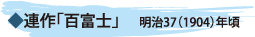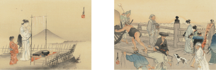 時には全体に溶け込むように、時には豪快に鎮座する多様な富士の姿を、人々の営み・自然・伝説などと共に情緒豊かに描きだしています。じっくり味わうとその軽快で優しい筆致や色彩と、構図の大胆さのバランスが絶妙で、月耕の魅力を存分に伝える連作です。