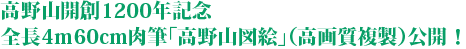 弘法大師空海による開創から1200年の歴史をもつ高野山。2004年に「紀伊山地の霊場と参詣道」として吉野・大峰、熊野三山及び各参詣道と共に世界遺産に登録されました。高野山の有する数々の宝物は明治より調査が行われ、 日本の歴史学の大家で文化財政策の重要人物・黒板勝美東京帝国大学教授が中心となり、大正10年霊宝館が建設されました。今回公開する「高野山図絵」は、この霊宝館の建設に向け、かねてより黒板教授に勧められ制作された記念すべき作品。 また、その大きさのみならず「大正広重」の落款を持つ肉筆画としても貴重な作品です。
