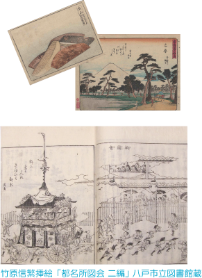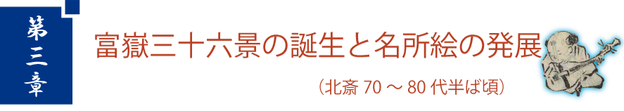 北斎の90年にも及ぶ人生の中で、現在誰もが知っている名作は、70代のわずか数年のものでしかありません。最も有名な「冨嶽三十六景」もこの頃にあたり、同時期の歌川広重の「東海道五十三次」と共に今では最も有名な風景画となりました。今回は、この二大傑作が生み出される背景として江戸後期版本の名所図会をご覧頂き、さらに、役者絵や狂歌などと融合した名所絵などもご紹介します。