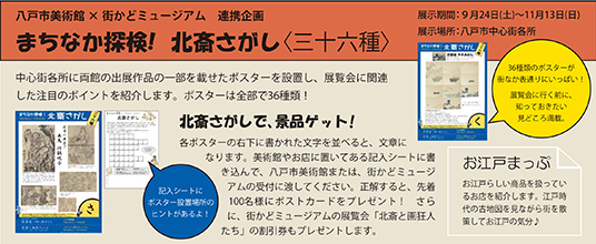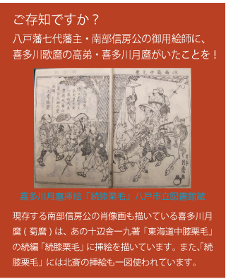 街かどミュージアムでは、この機会に北斎及び江戸後期文化の多様な姿をご紹介するため、「北斎と画狂人たち -知られざる挿絵・漫画・浮世絵の世界-」を開催します。ここでは、八戸市博物館・八戸市立図書館のご協力により、八戸藩に関連した作品も展示。八戸市美術館の北斎展と合せて観て頂くことで、八戸でしか実現しないオリジナルの「北斎展」をお楽しみ頂きたいと思います。