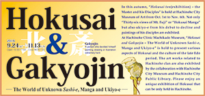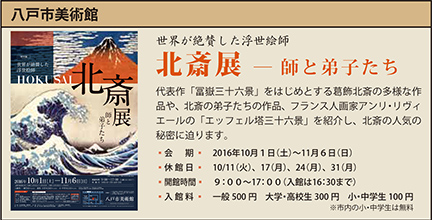 この秋、八戸市美術館で「北斎展―師と弟子たち」(10/1~11/6)が開催されます。「冨嶽三十六景」や「北斎漫画」などの代表的作品だけでなく、北斎のデビューから晩年に至る時期までの広範な浮世絵、弟子たちの肉筆画なども展示される豪華な内容です。