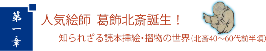 第一章は、現在一般にはあまり知られていないものの、北斎の名を世に広めた読本挿絵と狂歌摺物を、弟子たちの作品と共にご紹介。北斎の豪快で奇抜な挿絵は、自身の表現を大きく飛躍させ、また当時の読本人気を支えるものにもなりました。中でも、曲亭(滝沢)馬琴とのコンビは有名で、「椿説弓張月」は大ヒットし馬琴の名声も不動のものとなります。また、一般の市場には出回らず、文化人の間で配られた豪華な狂歌摺物も、北斎及び弟子たちが高く評価された仕事の一つです。「北斎」の名が使われ始めたこの時期は、大きなターニングポイントといえるのではないでしょうか。