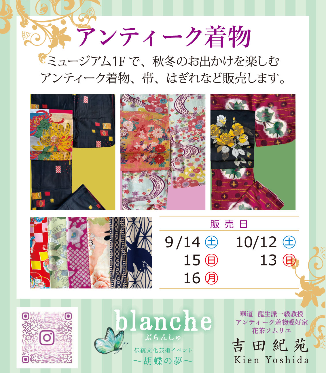 口絵以前の江戸時代の物語挿絵として、八戸市立図書館所蔵の読本挿絵をご紹介する他、春期展でもご好評を頂い た「アンティーク着物」の展示、さらに、独特の世界観をもった三沢市在住のイラストレーター齋藤さち子さんが 本展のために描いた4m超の大作も展示予定です。また、期間中(9/14~16、10/12,13)に、blanche さんによるア ンティーク着物、帯、はぎれなどの販売会も実施します。