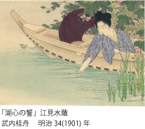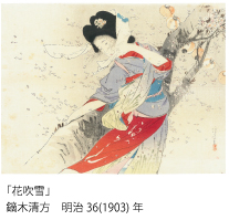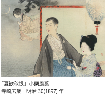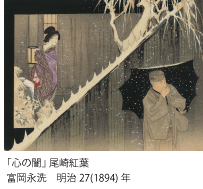 明治中期に生まれた近代小説に、「木版口絵」として挟み込まれていた近代美人木版画。「口絵のない小説は売れない」といわれたほど人気を博し、泉鏡花・幸田露伴・尾崎紅葉らの小説に、水野年方・鏑木清方・富岡永洗・梶田半古などが腕を振るい一世を風靡しました。物語の中の切なくも華やかな口絵の世界を堪能ください。